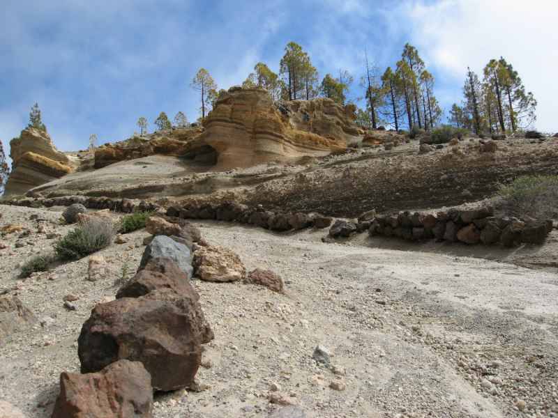 Ausgangspunkt für die Wanderung ist der Marktplatz von Vilaflor. Der Marktplatz wurde vor einigen Jahren neu gestaltet und wirkt sehr gepflegt. Der alte, steinige Weg, der uns jetzt zunächst in Kehren aufwärtsführt gehört zu einem Teil dem Wegenetz der Region Chasna lsora an und ist vorbildlich restauriert. Unser Weg führt zunächst durch ausgedehnte Kiefernwälder mit zum Teil uralten Bäumen. Nach etwa 30 Minuten lichten sich die Kiefern. und brachliegende Terrassenfelder mit Bimsauflage rücken näher, die von der längst vergangenen Tradition des Trockenfeldbaus zeugen.