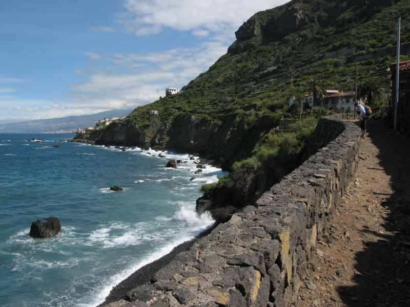 Der Weg führt zuerst durch den westlichen Teil von Puerto de la Cruz und später dann abenteuerlich oberhalb der Steilküste entlang. Am Ende einer Schlucht – einem Barranco – erblicken wir die direkt an den Klippen gelegene Ruine Casa Hamilton. In der Nähe befindet sich die von der Familie Hamilton errichtete Wasserpumpanlage La Gordejuela, Sie wurde 1905 erbaut, was damals revolutionär war, denn zuvor hatte man das kostbare Nass der zahlreichen Quellen ungehindert ins Meer fließen lassen. Dank der Förderanlage war es dann möglich, die umliegenden Regionen mit Wasser zu versorgen. Auf dem Weg zum Mirador San Pedro durchqueren wir eine parkähnliche Anlage mit einer abwechselungsreichen Vegetation.