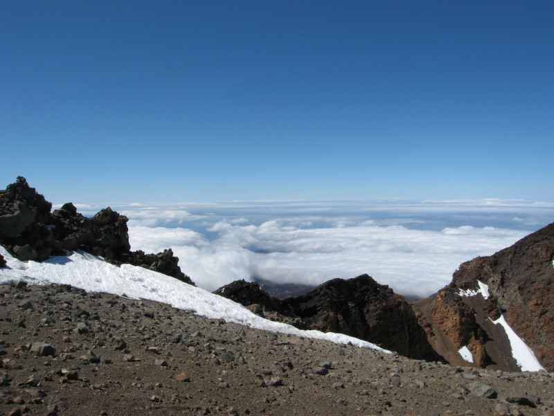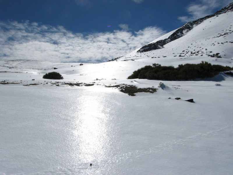 Hier oben erwartet uns ein starker und eisiger Wind der gehörig an uns zehrt. Der Sturm der letzten Tage und die damit verbundenen Niederschläge sind in dieser Höhe als Schnee nieder gegangen. Der Weg ist wirklich sehr anstrengend. Fast bei jedem Schritt sinken wir knöcheltief ein.
