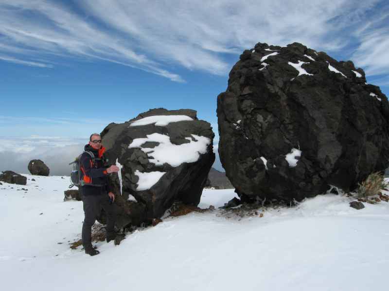 Eis und Schnee. Damit haben wir gar nicht gerechnet. Zum Glück können wir den Spuren von zwei vor uns gehenden Wanderern folgen. Die Orientierung ist nämlich durch den Schnee sehr erschwert. Endlich haben wir sie erreicht, die „Huevos del Teide“ oder auf deutsch, die „Eier des Teide“. Niemand weiß genau, wie diese Kolosse hierher gekommen sind.