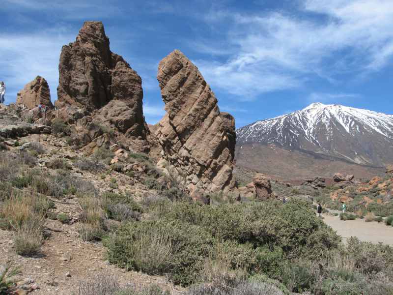 Nach der Wanderung fahren wir nun auf der TF21 zurück nach Puerto de la Cruz. Hierbei durchqueren wir die 17 km durchmessende Caldera mit ihrem abwechselungsreichen Farbspiel und interessanten Formen. Die Aussicht an der mitten durch den Park sich ziehende Landstraße ist sehr vielfältig und atemberaubend. Der Name Teide leitet sich aus “Echeide” ab, was in der Guanchensprache „Hölle“ bedeutet und auf die vulkanische Tätigkeit verweist. Wir kommen zu den Gesteinsformationen der „Los Roques“. Diese Formationen sind ein wahrer Besuchermagnet und der Trubel lässt uns nicht allzu lange verweilen.