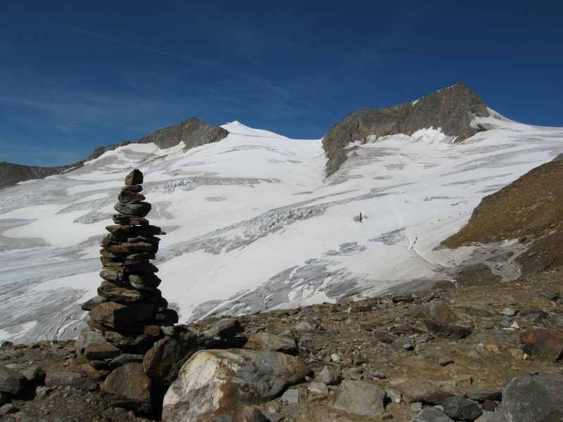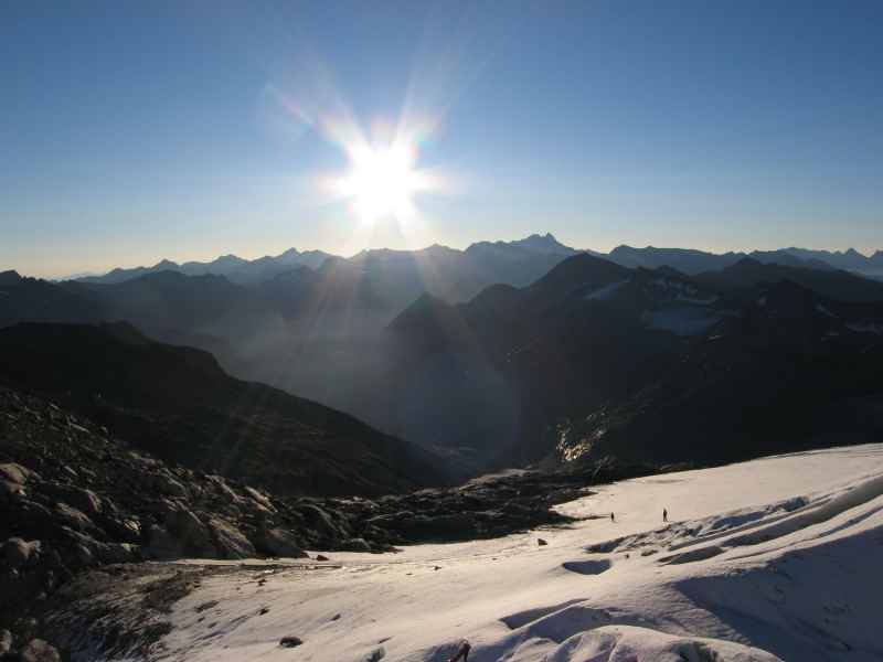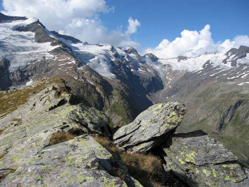 Wir stehen um 12.00 Uhr auf dem Gipfel in 3.329 m Höhe. Mit großartigen Blicken in alle Richtungen werden wir für unsere Mühen belohnt. Unser morgiges Tagesziel, die Neue Prager Hütte, können wir auch schon ausmachen. Über den Grat spazieren wir noch zu einem zweiten Kreuz. Blicke zurück und nach vorne - was immer uns die Wolken preisgeben. Auch an dem Rückweg erfreuen wir uns, lassen uns Zeit - ein Traumtag.