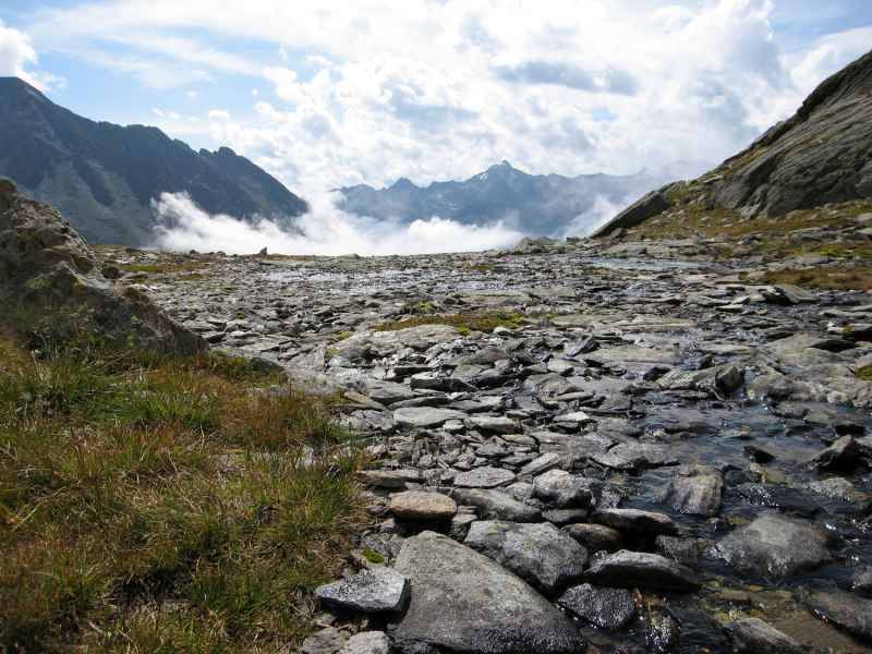 Das Wetter hält und zusammen mit den dahin ziehenden Wolken und dem ständigen Wechsel der Lichtverhältnisse entsteht eine tolle geheimnisvolle Atmosphäre. Auf dem Weg hinab treffen wir das zehnte Mitglied unserer Gruppe. Armin und Heidrun, die am Vortage von ihm in Mitternsill vom Bahnhof abgeholt wurde, kommen uns entgegen. Nun ist unsere Wandergemeinschaft komplett. Armin jedoch wird uns am späten Nachmittag wohl mit schwerem Herzen wieder verlassen. Gemeinsam erreichen wir gegen 14:00 Uhr die Johannishütte in einer Höhe von 2.121 Metern.