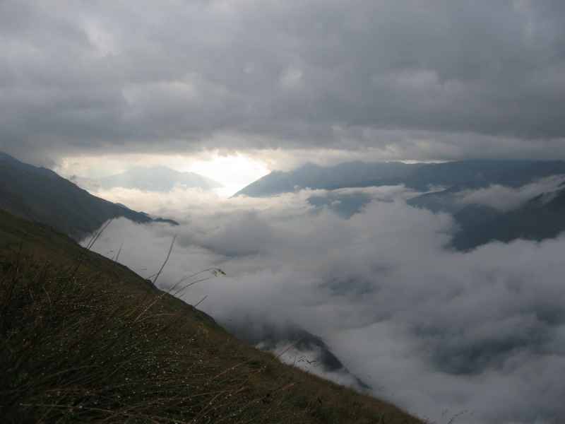 Der Tag beginnt mit starker Bewölkung. Die Wolken hängen tief in den Bergen. Meter für Meter steigen wir zur Sajatscharte bergauf. In Serpentinen geht es zügig nach oben.