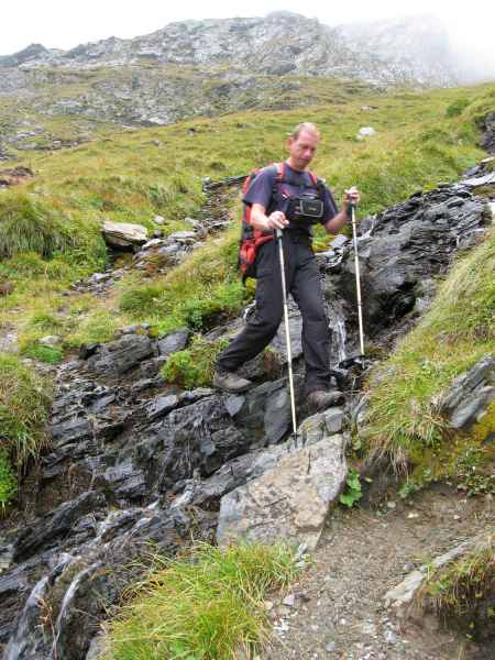 Unsere heutige Etappe führt uns zur Neuen Prager Hütte, auf der wir zwei Nächte verbringen wollen. Bis zum Lobbentörl haben wir es im Trockenen geschafft, aber das ändert sich jetzt. Es ist dicht gezogen, feucht, die Markierungen halten sich vor uns im Nebel verborgen. Die "Feuchtigkeit" wechselt zu handfestem Regen der bis zu Prager Hütte auch nicht mehr aufhört. Als wir auf der Neuen Prager Hütte ankommen sind alle bis auf die Knochen durchweicht. Aufgrund der Wetterprognose verbleiben wir auf Anraten unseres Bergführers Ernst, einen Tag länger auf der Neuen Prager Hütte und legen am nächsten Tag einen Ruhetag ein.