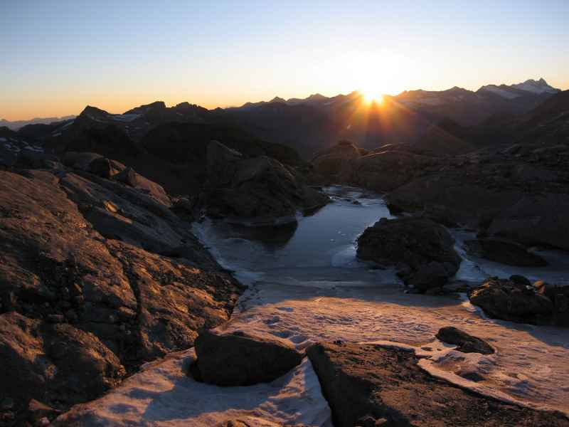 Über grobes Blockwerk erreichen wir schon nach kurzer Zeit die ersten Schneefelder. Am Horizont geht nun die Sonne auf. Er erhebender Augenblick. Schnell erobert sich der junge Morgen das Terrain. Im beginnenden Licht des neuen Tages legen wir die Steigeisen an und binden uns zu einer Seilschaft zusammen. Ernst gibt noch einige Anweisungen und Tipps und dann geht es los.