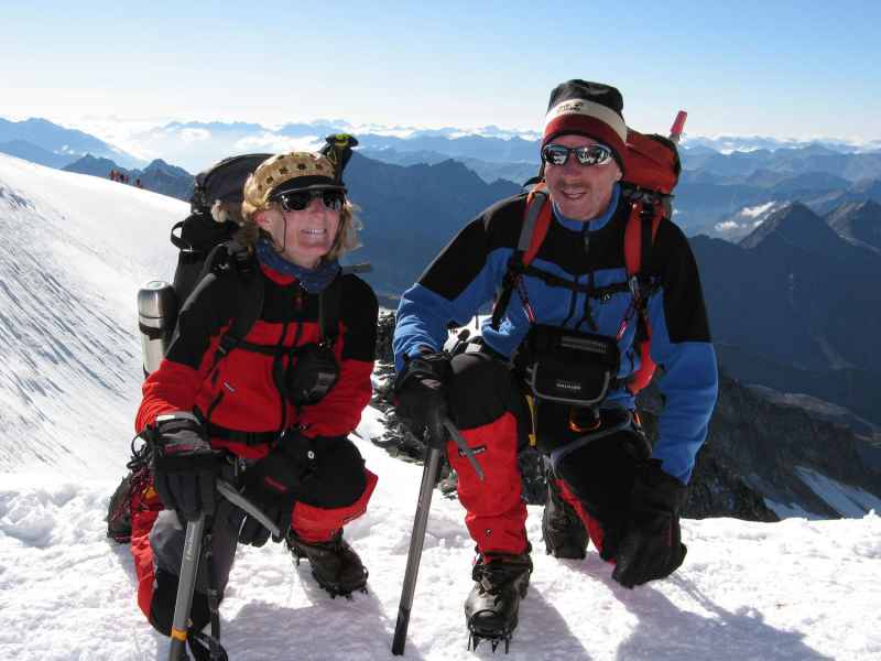Gegen 9:30 Uhr erreichen wir den Gipfel des Großvenedigers. Um das Abschmelzen der Schneekuppe und der damit einhergehenden Verkleinerung des Gipfelaufbaus entgegen zu wirken, wurde der Standort des Gipfelkreuzes kurzerhand verkleidet um ihn vor der Sonne zu Schützen. Ein paar Jahre wird es so wohl noch stimmen, dass der Großvenediger 3.667 Meter hoch ist. Der Schönheit der Welt tut das keinen Abbruch. Der traumhafte Blick reicht vom Watzmann, der Zugspitze, dem Dachstein bis hin zu Ortler und Dolomiten. Ernst erklärt uns die einzelnen Berge aber das beeindruckende Gesamtbild dieser grandiosen Kulisse ist unvergesslich genug.