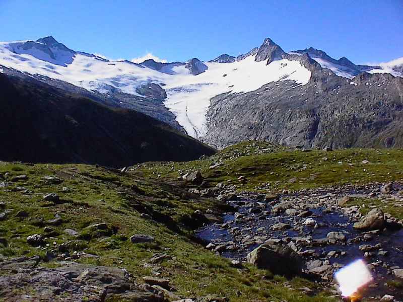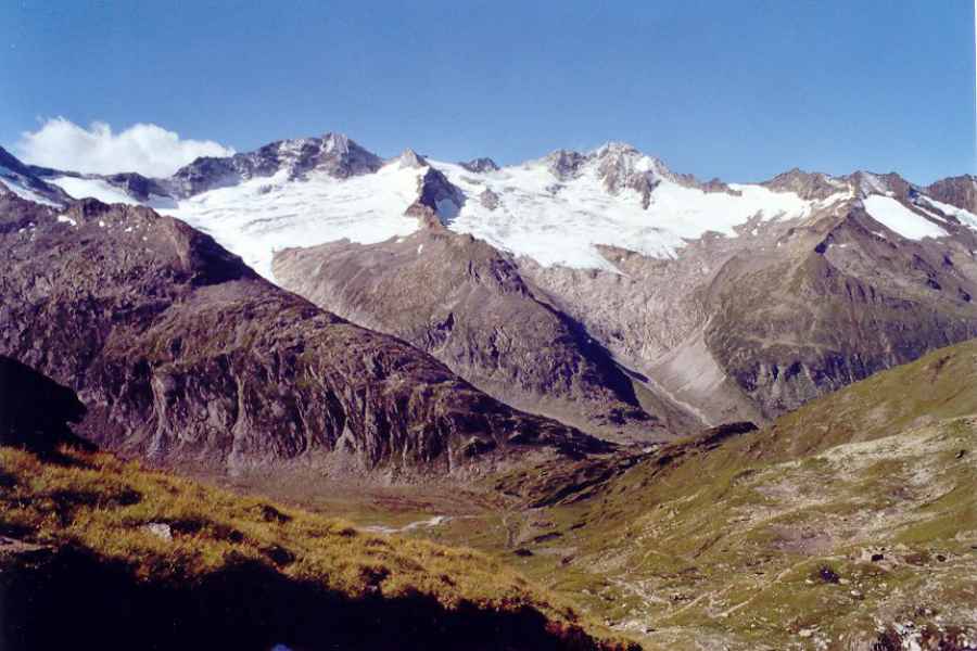 Heute machen wir uns gegen 8.00 Uhr auf den Weg. Unser Tagesziel ist die Kasseler Hütte. Der Tag verspricht wieder sehr schön zu werden. Der Himmel ist blau, aber wir können unsere Wanderung im Schatten beginnen. Zunächst verläuft der Weg südöstlich ansteigend, zuletzt in vielen Kehren hinauf in die Lapenscharte (2700 m). Wir machen eine kurze Pause hier in der Scharte und Heinrich findet sogar eine Stempelstelle für Höhenwege vor. Jenseits der Scharte steigen wir zunächst in einem weit ausholenden Bogen, dann in Kehren hinab ins Lapenkar bis ca. 2250 m. Hier machen wir eine ausgiebige Rast in der warmen Sonne, essen, liegen, genießen. Dann geht es in einem weit nach Süden ausholenden Bogen durch den Torschluss des Stillupgrundes am nahen Gletscher vorbei. Es ist beeindruckend, mit welcher Kraft der ehemals wesentlich größere Gletscher den Untergrund geformt hat. Auf dem weiteren Weg zur Hütte, der ohne große Auf- und Abstiege verläuft, stürzt Manfred auf einer glatten nassen Felsplatte auf die rechte Schulter. Gegen 14.30 Uhr erreichen wir die Kasseler Hütte (2177 m), sitzen zunächst noch in der Sonne, füllen unsere Flüssigkeitsreserven auf und genießen einen Apfel- bzw. Topfenstrudel. Durch Arbeiten an der Wasserversorgung kommt es vorübergehend zu einem Engpass. Waschraum/Toilettenbenutzung sind tabu und auch in der Küche gibt es kein Wasser mehr. Irgendwann jedoch sind die Probleme behoben und nach einer Wäsche (allerdings ohne das sonst hier mögliche warme Wasser) genießen wir das Abendessen. Inzwischen haben sich Wolken vor die Sonne geschoben und es regnet. Es wird über den möglichen Weg und das Wetter für den morgigen Tag diskutiert.