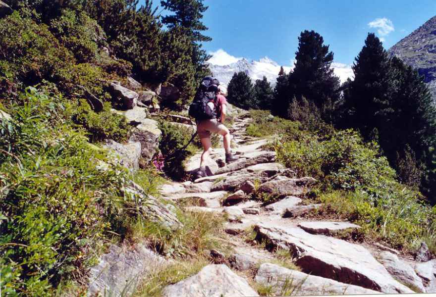 Von der Olperer Hütte steigen wir in einer Stunde ungefähr 600 Höhenmeter zum Schlegeisspeicher herab. Vorbei an schönen Alpenpflanzen wie Alpen-Geiskraut, Glockenblumen und Alpendost – der Schnee ist schon wieder entschwunden – führt der Weg in vielen Kehren hinab ins Tal. Nach einigen Tücken, die Bushaltestelle, an der wir warten, existiert als solche nicht, fahren wir wiederum Bus. Diesmal bringt er uns zum Breitlahner auf ca. 1200 m Höhe, von wo aus wir unseren Aufstieg zur Berliner Hütte bei Sonnenschein beginnen. 960 Höhenmeter gilt es, zu bewältigen. Der Weg selbst hat keine Schwierigkeiten, überwiegend ein breiter Fahrweg, jedoch sehen wir an einem steilen Hang unser erstes Edelweiß in freier Natur. Die Blicke sind phantastisch, das Waxeckkees, die gut sichtbaren Seitenmoränen – Erdgeschichte zum Anfassen. Nach drei Stunden haben wir die Hütte auf 2040 m Höhe erreicht. Die Berliner Hütte ist eine Hütte der Superlative – das Grand Hotel der Zillertaler, um die Worte von Franz Stock zu benutzen. 1879 errichtet wurde die ursprünglich kleine Hütte durch zahlreiche An- und Ausbauten zu einer der größten Hütten im Alpenraum (ca. 200 Schlafplätze). Dass sich zur damaligen Zeit die „Hauptstadtsektion“ angemessen präsentieren wollte, zeigen der gewaltige Speisesaal und das Haupttreppenhaus. Als einzige Hütte des DAV steht die Berliner Hütte unter Denkmalschutz. Wir sind im Winterraum untergebracht und genießen eine Dusche. Danach schmeckt der Germknödel nochmal so gut, den wir auf der Sonnenterrasse genießen.