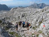 Nach kurzem Aufstieg erreichen wir den Hohen Trog auf 2.354 Metern Höhe um dann auch gleich wieder hinab in Richtung Hoßkogel abzusteigen. Wohin man auch sieht, überall finden wir nun Megalodonten, versteinerte Zeugnisse längst vergangener Zeiten. Die bekanntesten Vertreter dieser Gruppe sind die sogenannten Hirsch- oder Kuhtrittmuscheln aus der Trias, die heute als Fossilien wir hier im Dachsteinkalk und ähnlichen Gesteinen der nördlichen Kalkalpen zu finden sind.
