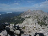 Immer unterhalb des Hoßkogels bewegen wir uns mit leichter Kletterei in Richtung Hoßwandscharte. Es ist ein spannender Weg mit interessanten Ausblicken. An der Hoßwandscharte zweigen wir vom Weg ab und steigen auf die 2.247 Meter hohe Hohe Hoßwand. Von hier haben wir einen wunderschönen Blick auf den Gosaukamm mit der Bischofsmütze und auf die Gosauseen. Unser Weg führt nun weiter über große Steinplatten. Bei schlechten Sichtverhältnissen hat man hier sicher Schwierigkeiten sich zu orientieren. Aber für uns ist es heute eine Genusstour. Der Untergrund ist fest und griffig und so kommen wir recht zügig voran.