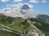 Weiter geht es nun in Richtung der Hofpürglhütte, unserem Ziel für den heutigen Tag. Nun wandern wir unterhalb der Bischofsmütze entlang. Die Große Bischofsmütze ist mit einer Höhe von 2.458 Metern der höchste Gipfel im Gosaukamm des Dachsteinmassivs. Dieses bekannte Wahrzeichen verlor bei einem massiven Bergsturz am 22. September 1993 einen 200 m hohen Pfeiler und damit sehr viel von seiner markanten Erscheinung. Seither kommt es immer wieder zu Nachstürzen, wie 1999 und 2001.