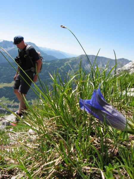 Tiefe und ferne Blicke auf das Gartnertal eröffnen sich uns und wechseln sich ab mit nahen Blicken auf Glockenblumen und Vergissmeinnicht. Gegen 11:30 Uhr erreichen wir den Gipfel der Gartnerwand auf 2.377 Metern Höhe. Wir halten eine kurze Rast und trinken etwas Wasser. Nun noch etwas essen und schon bald gehen wir weiter.