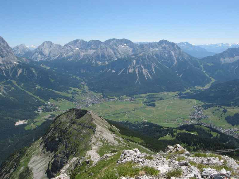 Hier machen wir bei allerschönster Aussicht auf die Zugspitze und die in der Umgebung liegenden Berge eine Stunde Rast und haben Gelegenheit die neugierigen Bergdohlen bei ihren Flugkünsten zu beobachten.