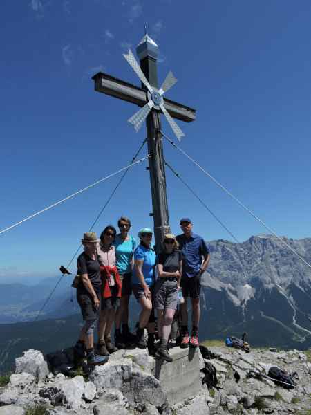 Gegen 10:00 Uhr oder nach 3 Stunden und 50 Minuten, erreichen wir das Gipfelplateau mit diversen Aussichtsplattformen und jeder Menge Menschen. Hier erwartet uns ein wahrer Gipfelzirkus oder auf bayrisch – eine Mordsgaudi. Auch unsere 2. Gipfelmannschaft befindet sich auf den letzten Metern – Andrea macht die Führung und gibt das Tempo vor - die Anstrengung ist deutlich zu erkennen. Für uns alle ist es eine riesige Freude die 1.800 Höhenmeter bewältigt zu haben – egal ob in einer oder zwei Tagesetappen und gemeinsam hier oben zu stehen.