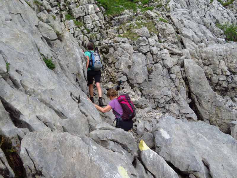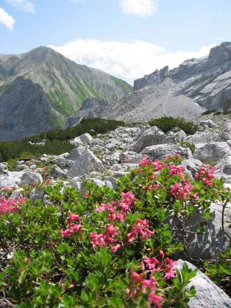 Zum Anfang geht es über eine Skipiste hinauf. Kein abwechslungsreicher Weg aber wir gewinnen rasch an Höhe. Schon bald erreichen wir die ersten Latschenfelder und über Schottergestein finden wir den gut markierten Weg. An einer Stelle oberhalb des Schuttkars schlagen wir den Weg über den Schützensteig ein. An dieser Stelle müssen wir auf Steinschlag Obacht geben – Oberhalb von uns grasen Schafe, die leider öfter Steine lostreten, die dann unberechenbar niedergehen. Wir durchqueren diese Passage aufmerksam aber zügig.