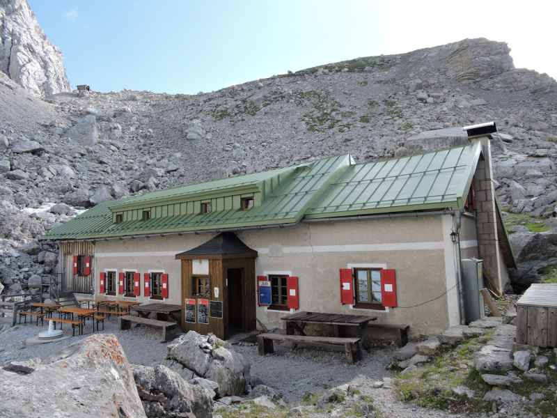 Wir selbst erreichen die Wiener-Neustädter gegen 8:00 Uhr. Knapp zwei Stunden von der Talstation – gar nicht so schlecht. Hier machen wir 15 Minuten Pause. Als erste Hütte an der Zugspitze wurde die Wiener-Neustädter-Hütte auf 2.209 Metern Höhe im Jahr 1884 erbaut. Sie dient für den bereits 1879 eröffneten Klettersteig durch das Österreichische Schneekar als Stützpunkt. Nach dieser Trinkpause folgen wir nun unseren vorausgegangen Mitwanderern.