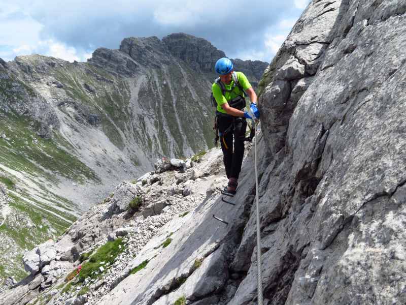 Schon bald erreichen wir den gut markierten Einstieg zum Werner-Riezler-Steig und setzen die Helme auf. Auch in diesem Bereich ist mit Steinschlag entweder verursacht durch Tiere oder auch durch unachtsame Wanderer. Der deutlich exponierte Werner-Riezler-Steig führt durch die Nordwestflanke des Thanellers und ist nur an einigen Stellen mit Drahtseilen gesichert. Daher erfordert er Trittsicherheit und Schwindelfreiheit. Auch einfache Kletterstellen im I. Schwierigkeitsgrad sind nicht zu unterschätzen.