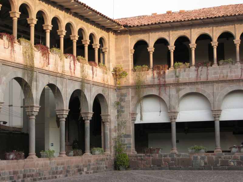 Die nächste Stätte, die wir besichtigen, ist das Kloster Santo Domingo. Dieses im spanischen Stil, mit schönen Arkadengängen, errichtete Kloster wurde auf den Mauern des ehemaligen Tempels der Sonnenjungfrauen begründet. Beim Einmarsch der Konquistadoren 1533 wurde der Tempel bis auf die Grundmauern geschliffen. Mauro versucht uns zu veranschaulichen, wie aufwendig und herrlich die einzelnen Tempelelemente und der dazu gehörige Garten des Sonnentempels, mit Gold und Silber gestaltet, ausgesehen haben müssen. Mauro führt uns zu einer goldenen Platte an einer Wand des Tempels. Er erläutert uns anhand der darauf dargestellten Abbildungen das Weltbild der Inka. Diese goldene Sonnenscheibe stellt nämlich den Kosmos der Inka mit den Gottheiten „Inti“ für die Sonne und „Pachamama“ für die Erde sowie der Ober- und Unterwelt dar.