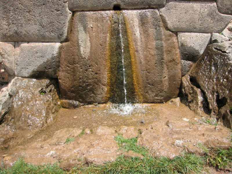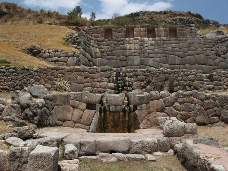 Unser nächstes Ziel ist Tambo Machay, das Bad der Inka. Es ist ein Wasserheiligtum in der Nähe von Cuzco ebenfalls aus der Inka-Zeit. Dort ergießt sich das Wasser in Kanälen über vier terrassenförmige Ebenen. Dafür wurde der natürliche Felsen behauen und künstliches Mauerwerk eingearbeitet. Mehrere Nischen im Fels führen das Wasser zu den Wasserspielen. Eine Quechua-Legende schreibt den drei kleinen Wasserläufen besondere Wirkungen zu. Trinkt man von dem Wasserlauf rechts unten, so soll man davon jünger werden, trinkt man vom Wasserlauf links unten, so wird man Zwillinge bekommen, und der obere Wasserlauf soll eine segnende Wirkung haben. Diese künstliche Anlage zeigt den Respekt, den die Inka vor der Natur hatten, aber auch ihre Herrschaft über sie.