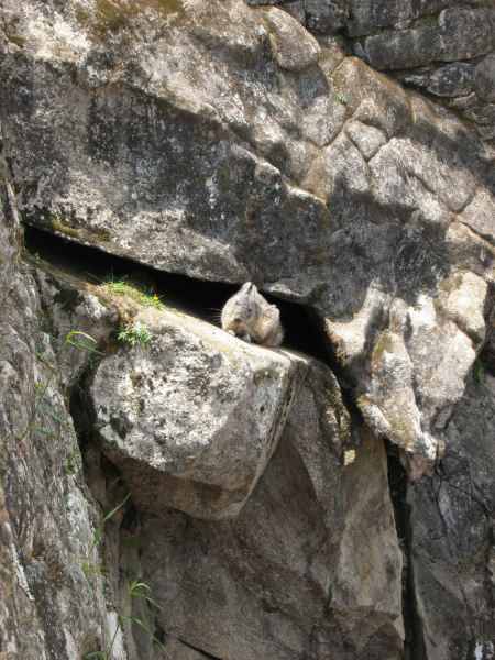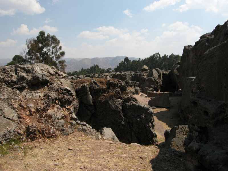 Vorbei an Anbauflächen für Kartoffeln und Getreide und an Weideflächen für Schafe führt unser Weg immer in Richtung Cuzco hinab. Bald taucht eine archäologische Ausgrabungsstätte auf, der Mondtempel. Diese archäologische Stätte besitzt eine der schönsten Inkakonstruktionen in einer Höhle, zu der sie exakt bearbeitete Felsen hinzufügten, die perfekt ineinander passen ohne einen Millimeter Platz zwischen den Steinen zu lassen. Die Struktur hat schöne gewölbte Nischen und leere trapezförmige Einbuchtungen nach typischer Inkaart. Vor der Höhle gibt es einen Felsen in Form eines Altars, was zu der Annahme führt, dass dies ein Platz für Opferungen war. Leider darf man sie im Moment nur von außen betrachten, da man Angst hat, dass die vielen Touristen wichtige Spuren der Vergangenheit stören. Vor dem Eingang sitzend erläutert Mauro uns die Symbolik von Schlange, Kondor und Puma deren Abbildungen im Bereich des Eingangs in den Stein gehauen wurden und teilweise noch sichtbar sind. Die Darstellungen von Puma und Kondor wurden von den Spaniern herausgeschlagen. Der Glaube der Inka richtete sich danach, dass die Welt aus drei Ebenen besteht, der Oberwelt, der "normalen" Welt sowie der Unterwelt. Hierbei stellen die Schlange die Verbindung zur Unterwelt und der Kondor die Verbindung zur Oberwelt dar.