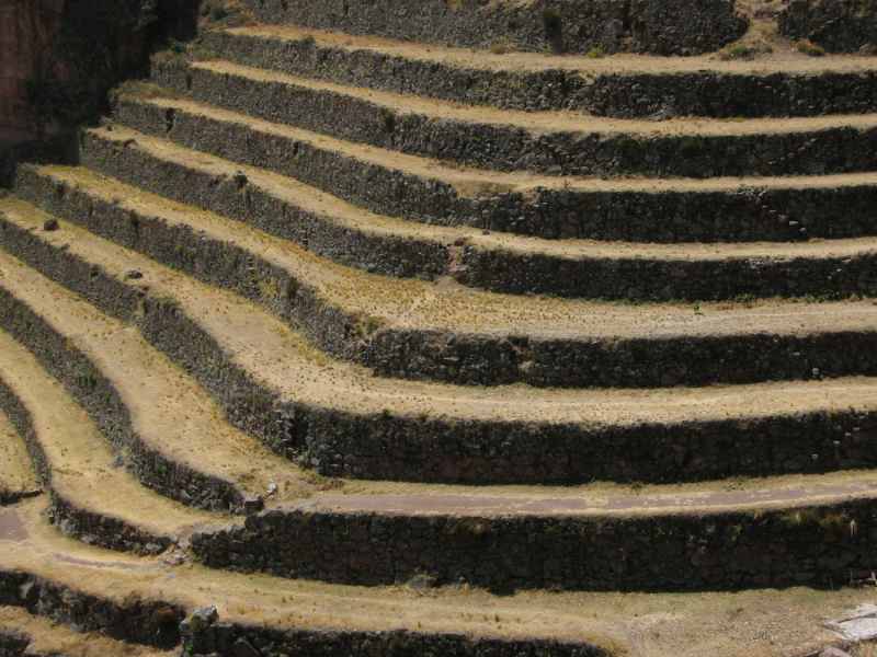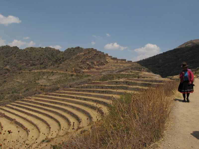 Nachdem wir alle Mitreisenden unserer Gruppe wieder eingesammelt haben, einige Damen haben in den Verkaufsräumen ein wenig länger verweilt, fahren wir mit dem Bus nach Pisac. Wir fahren durch das heilige Tal der Inka, dem Urubamba-Tal, und gewinnen Meter um Meter an Höhe. Die ehemalige Bergfeste Pisac - heute eine Ruine - liegt 30 Kilometer von Cuzco entfernt. Die Festung Pisac ist fünfmal größer als die sagenumwobene Inka-Stadt Machu Picchu. Gleich zu Beginn kommen wir zu den berühmten Inka-Terrassen. Die Terrassen sind stufenartig in den Berghang angelegt, um die Anbaufläche zu erhöhen. Zum Teil sind die einzelnen Stufen nur ein paar Meter breit, je nach dem wie steil es an dieser Stelle ist. Angebaut wurden hauptsächlich Mais, Kartoffeln, Quinoa, Amarant, Kürbis, Tomaten, Erdnüsse und Paprika. Die Inkas benutzten die Terrassen auch als Versuchsfelder, um Pflanzen aus dem Amazonas an die Höhe zu gewöhnen. Mit einem ausgeklügelten Bewässerungssystem sind die Terrassen noch heute funktionstüchtig.