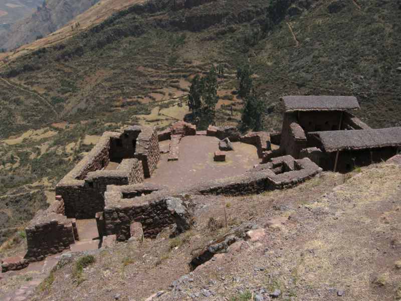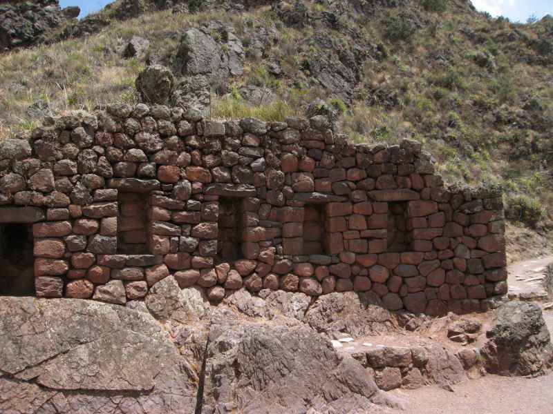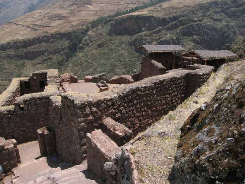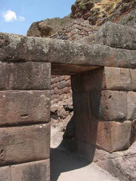 Wir wandern nun durch diese Terrassen unterhalb der Bergfeste und können in den Lehmwänden alte Gräber entdecken. In diesen Erdhöhlen wurden die Toten zusammen mit einigen Opfergaben bestattet. Oft sind diese Gräber aber schon in früherer Zeit geplündert worden. In Pisac sind die Stadttore und zahlreiche Bauten trotz der jahrhundertelangen Erosion noch gut erhalten geblieben. Der Weg ist teilweise ziemlich steil und eng. Wir kommen immer wieder an alten Ruinen vorbei und sind wieder einmal erstaunt, wie präzise zu dieser Zeit ohne technische Hilfsmittel gearbeitet wurde. Die einzelnen Mauersteine sind exakt behauen und passen genau ineinander.