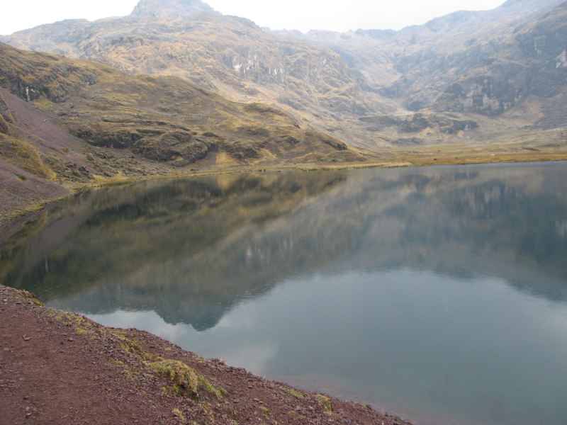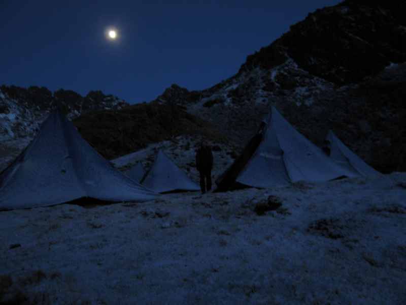 Wir folgen einem kleinen Wasserlauf auf der rechten Seite bergauf. Der höchste Punkt des Tages ist der Ipsayjasa-Pass auf 4.502 Metern Höhe. Hier werden wir von einem heftigen und kalten Wind empfangen. Es ist sehr frostig. Es dauert nicht lange und es fängt auch noch an zu graupeln und wir legen unsere Regenkleidung an. Jeden Tag, fast zur gleichen Zeit, gewinnen die wassergesättigten dunklen Wolken aus dem Amazonasbecken die Oberhand über das Wetter in dieser Region und es beginnt leicht zu regnen. Im Tal weiter unten können wir unsere heutige Zeltstadt am Rande eines idyllischen Sees ausmachen. In einem kurzen und schnellen Abstieg, wir bewegen uns schnell weil es so kalt ist, erreichen wir unsere Zelte.