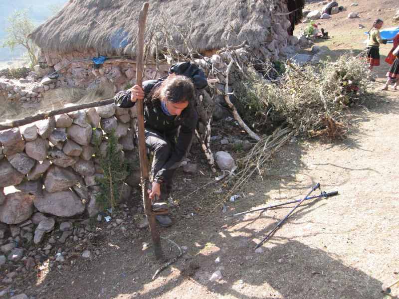 Auf unserem Weg gelangen wir an ein kleines Gehöft. Aldo nutzt die Gelegenheit und demonstriert uns den Gebrauch der Taclla, des Trittgrabstocks der traditionellen Bodenbewirtschaftung. Mittels dieses Werkzeugs werden Bodenlöcher hergestellt, in die dann die Kartoffeln gepflanzt werden. Übrigens ist Peru das Kartoffelanbauland schlechthin. So um die 3.000 verschiedene Sorten wachsen hier. Das Internationale Kartoffelinstitut befindet sich nicht ohne Grund in Lima, der Hauptstadt Perus.