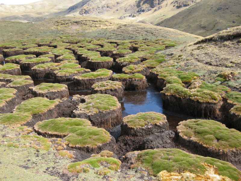 Wir beginnen unsere Wanderung bei schönem kaltem Wetter und genießen den Blick auf die Eisgipfel von Veronica mit ihren 5.750 Höhenmetern und dem Huacratanca mit 5.039 Höhenmetern, unserem Ziel für den nächsten Tag. Hier oben erreichen wir ein Plateau das mit kleinen Wasserläufen durchzogen ist. Wie kleine Inseln liegen große dicke Moospolster mit deren Hilfe wir die Wasserläufe balancierend überqueren. Das Springen von Polster zu Polster erinnert ein wenig an „Spiel ohne Grenzen“ – nur ohne Schmierseife. Diese Polster bilden eine stabile Unterlage und werden mit zunehmender Höhe immer dichter. Später, noch weiter oben, bilden diese Moospolster eine einheitliche Fläche. Wir gehen dann wie auf einem hochflorigen Teppich.