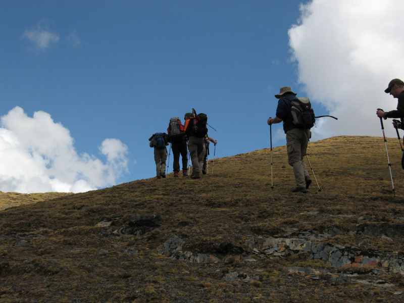 Langsam gewinnen wir an Höhe, an die dünne Luft müssen wir uns erst gewöhnen. Außerdem wird es zunehmend kälter. Die Vegetation hat sich hier oben geändert. Moosähnliche Pflanzen dominieren nun. Langsam erklimmen wir den anvisierten Pass. Punto Alto - auf 4.705 Metern Höhe. Es zieht dicht und beginnt auf dem Pass sogar zu graupeln. Ein Blick auf unsere Schuhe lässt die Frage aufkommen, ob es sich hier vielleicht um eine "Dreckingtour" handelt. Nun geht es hinab zu unserem heutigen Pausenplatz an dem Begleitmannschaft schon das Gruppenzelt aufgebaut hat. Nach der Pause mit Geflügelsuppe und Coca-Tee geht es nun nur noch weiter hinunter in das Tal.