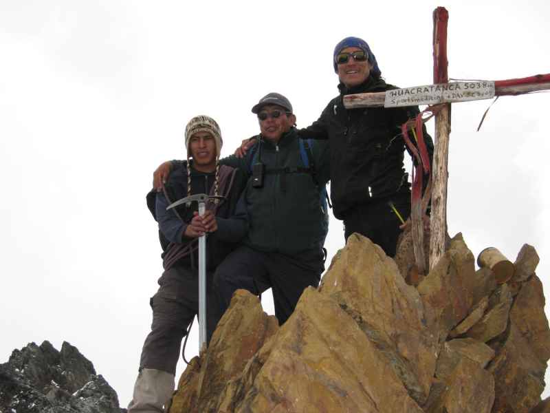 Heute steht die Besteigung des Huacratanca an – 5.039 Meter. Um 6.00 Uhr brechen wir zur Besteigung dieses Berges auf. Wir haben heute wieder herrlichstes Wetter und ein gute Sicht. Auch die Landschaft zeigt sich im Sonnenlicht heute von ihrer schönsten Seite. Der Aufstieg zum 4.800 m hohen Huacratanca-Paß ist ein einziger Genuss. Die Sonne taucht die Landschaft in ein fantastisches Licht. Der Schnee glitzert und schmückt die Pflanzen, die selbst in dieser Höhe ihren Lebensraum finden. Die Blicke in die Ferne, der Anblick des angestrebten Gipfels, die kleinen Schmuckstücke am Weg, schöner kann eine Tour nicht sein.