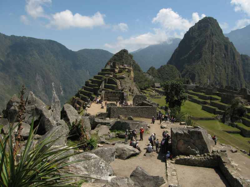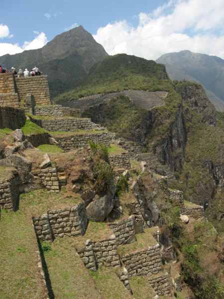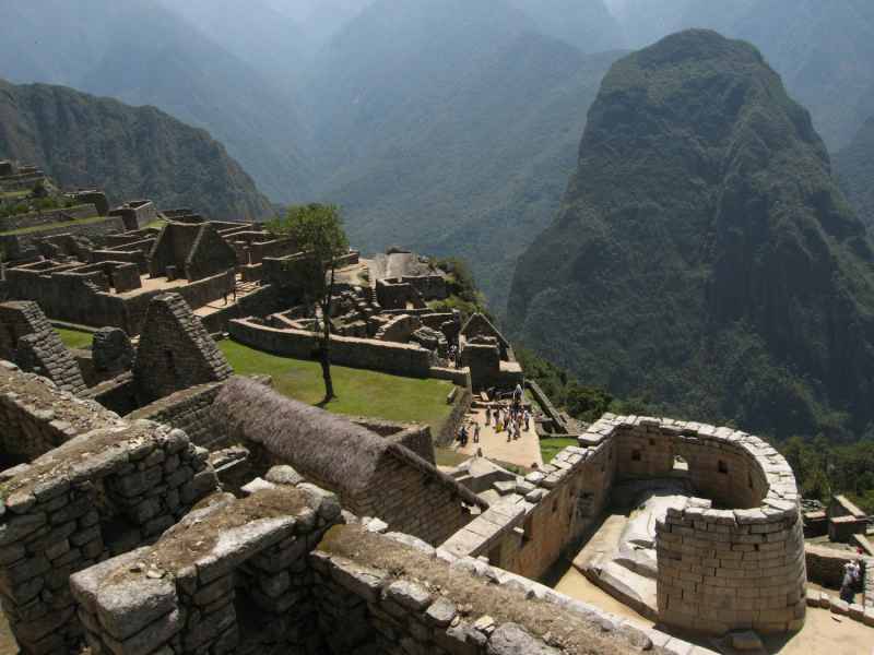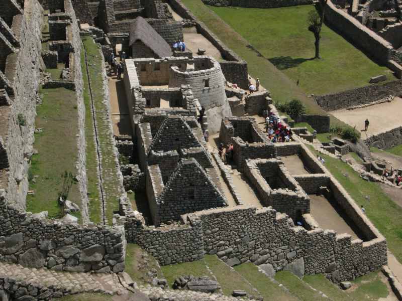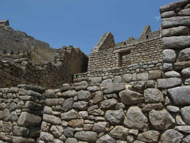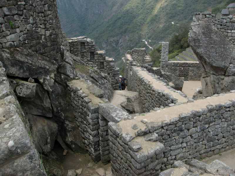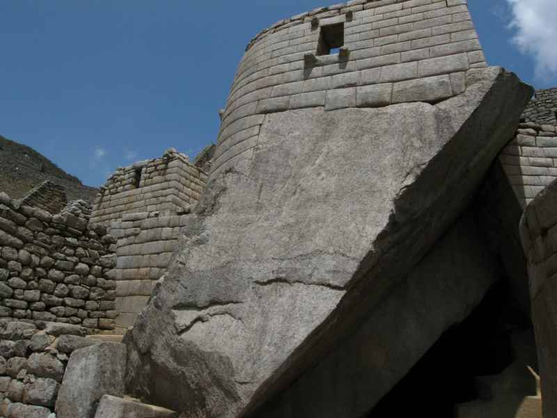 Nach einiger Zeit gelangen wir auf ein Plateau auf dem eine weitläufige Tempelanlage errichtet wurde. In der Mitte des Tempelbereichs liegt der Intihuatana, ein mächtiger Felsbrocken, von dem die Inka glaubten, an ihm sei die Sonne angebunden. Dieser Ort markiert genau die Mitte des Tempelbereiches. Rund um das Intihuatana stehen die Mauerreste der Tempel, Priesterpaläste und Mausoleen im typischen Inka-Baustil. Die tonnenschweren Blöcke sind mörtellos aufeinander gesetzt, nur trapezförmige Durchgänge auf denen wiederum tonnenschwere Abdecksteine liegen, unterbrechen die Mauern.