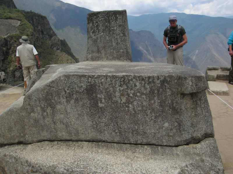 Nun steigen wir über Treppen zum Intiwatana, dem „Ort, an dem die Sonne angebunden wird“. Hierbei handelt es sich um einen aus einem Felssockel herausragender Granitblock der zu astronomischen Zwecken genutzt wurde. Anhand der Anordnung konnten wichtige Informationen zu Sonnenlauf, Tageszeit, Sternenbilder und Planetenbahnen gewonnen werden. Es wird deshalb auch „Sonnenobservatorium genannt“.