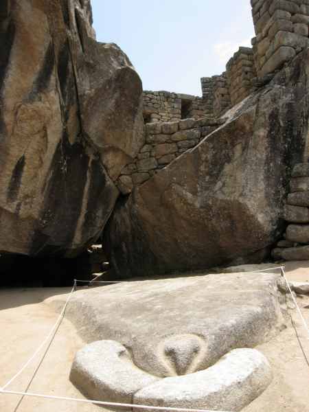 Nun gelangen wir zum Tempel des Kondors. Der Kondor gilt als der Mittler zwischen den Welten. Schön zu erkennen sind Schnabel und Halskrause des in den Stein gehauenen Kondors. Der Kondor wird auch heute noch verehrt.
