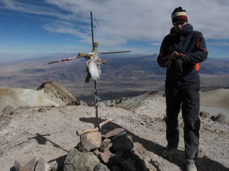5.039 Meter – für viele, auch für Dagmar und mich, ist dieses der derzeitige persönliche Höhenrekord. Leider ist die Sicht nicht allzu gut. Der Gipfelaufbau lässt uns nur wenig Platz. Nacheinander stellen wir uns zum obligatorischen Gipfelfoto auf. Nachdem alle Bilder gemacht sind, verwandeln unsere Bergführer die zwei Holzbalken wieder in ein richtiges Gipfelkreuz.