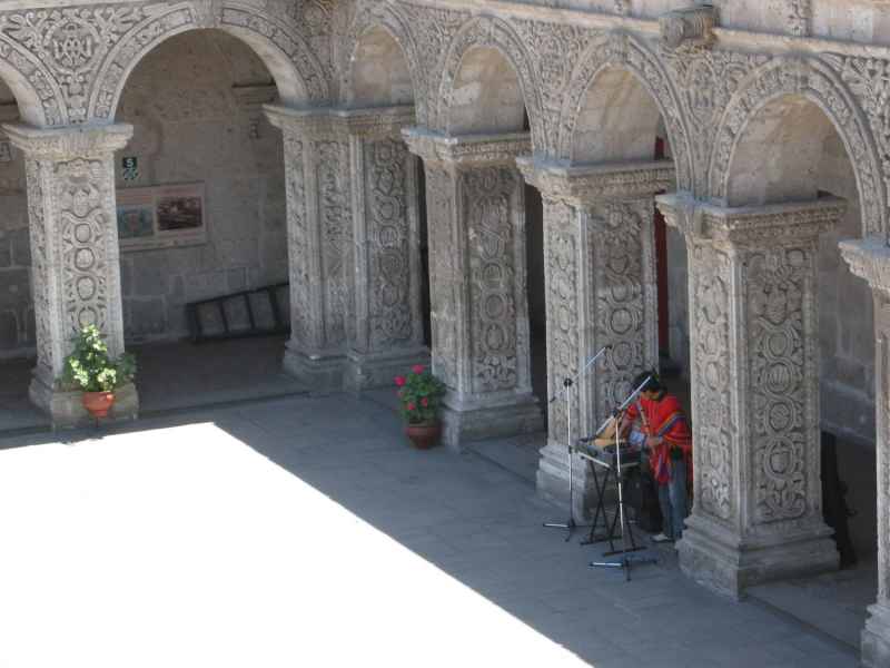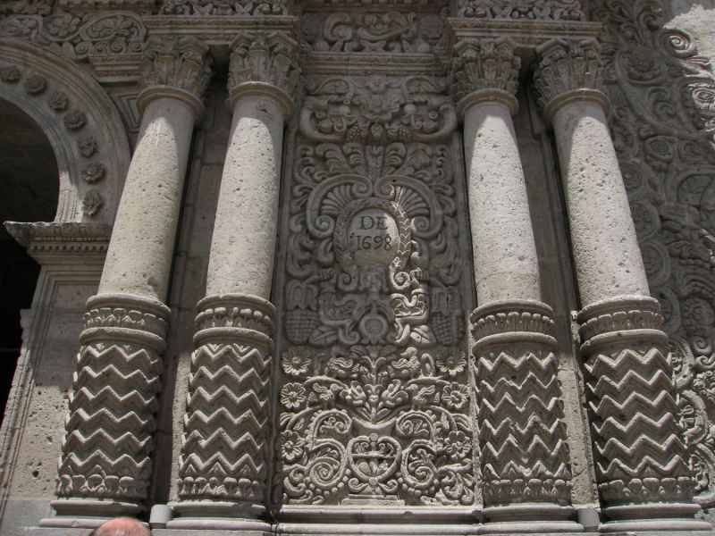 Jetzt besuchen wir die Kirche „Iglesia de la Compañía“. Sie liegt am unteren Ende der Plaza de Armas, dem Hauptplatz von Arequipa. Sie wurde 1595 bis 1698 für die Jesuiten gebaut und gilt als gutes Beispiel für die Vermischung des barocken und mestizischen Baustils. Die Fassade zeigt vielfältige Elemente der indigenen wie auch der spanisch-katholischen Kultur. Erst seit 1950 ist die wieder restaurierte Sakristei zugänglich, die gleichfalls reich mit farbenfrohen Ornamenten geschmückt ist. Die Kirche mit ihrer überreich dekorierten Fassade gilt als eines der wichtigsten Werke des »Mestizenbarock« vom Ende des 18. Jahrhunderts. An die Kirche schließt sich noch ein Komplex mit schönen Arkardengängen an. Auch diese Säulen und Rundbögen sind über und über mit Verzierungen des Mestizenbarock verschönert. Die Detailverliebtheit ist beeindruckend.