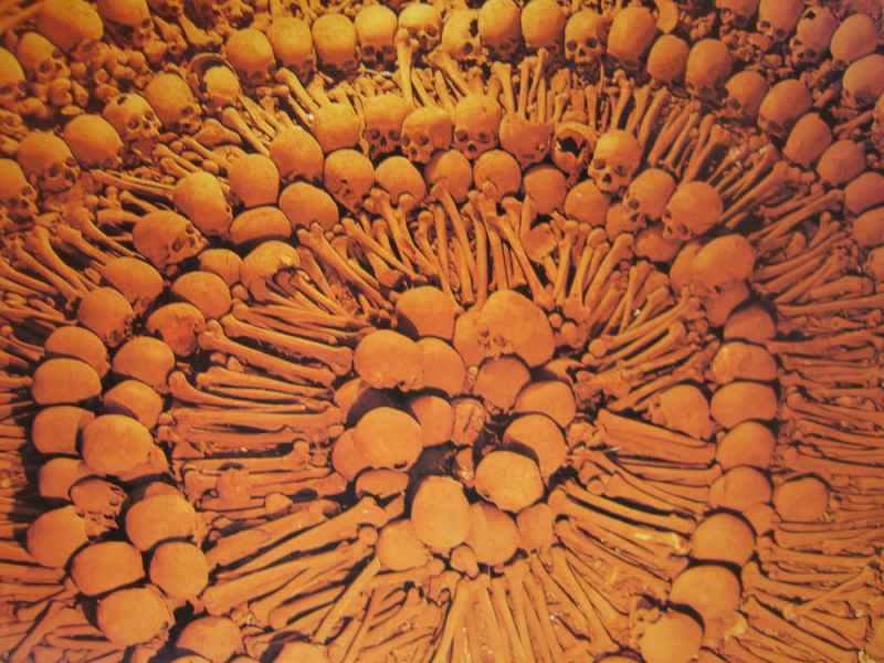 Lohnend ist auch ein Besuch der Katakomben des Klosters. Nachdem sich die Augen an die Dunkelheit gewöhnt haben, sehen wir, dass sich unter dem schmalen Steg, über den wir gehen, rechts und links riesige Gruben befinden, die randvoll gefüllt sind mit weiß schimmernden menschlichen Knochen und Totenköpfen! Wir wandeln also buchstäblich über Leichen – teilweise kunstvoll arrangiert. Man schätzt, dass hier 70.000 Menschen ihre letzte Ruhestätte fanden.