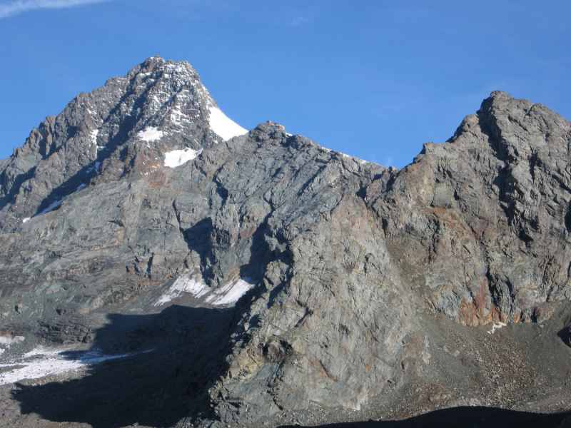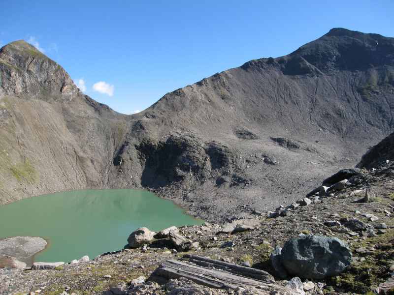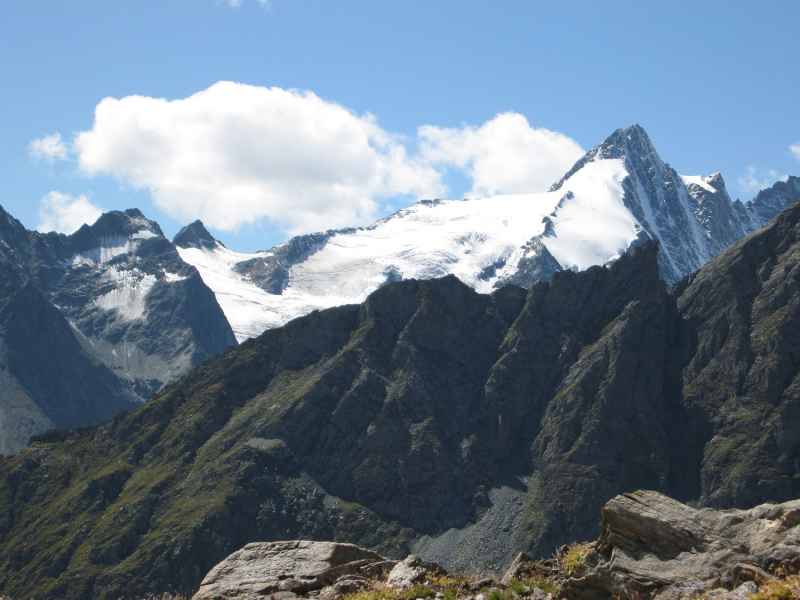 Der Tag bietet uns blauen Himmel und beste Fernsicht auf den Großglockner und weitere hohe Gipfel. Armin schlägt ein moderates Tempo an und Gila bildet wie üblich den Schluss. Der Großglockner ist mit einer Höhe von 3.798 Metern der höchste Berg Österreichs. Er liegt auf der Grenze zwischen Kärnten und Osttirol und ist der höchste Gipfel der Glocknergruppe, einer Gebirgsgruppe entlang des Hauptkamms der Hohen Tauern. Der Gipfel selbst liegt auf dem vom Hauptkamm nach Süden abzweigenden Glocknerkamm, auf osttiroler Seite. Der charakteristische pyramidenförmige Gipfel besteht eigentlich aus zwei Erhebungen, dem Großglockner und dem Kleinglockner mit 3.770 Metern Höhe, die durch die „Obere Glocknerscharte“, die höchstgelegene Scharte Österreichs getrennt sind.