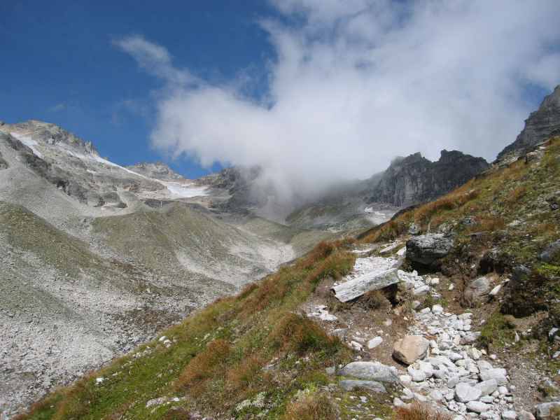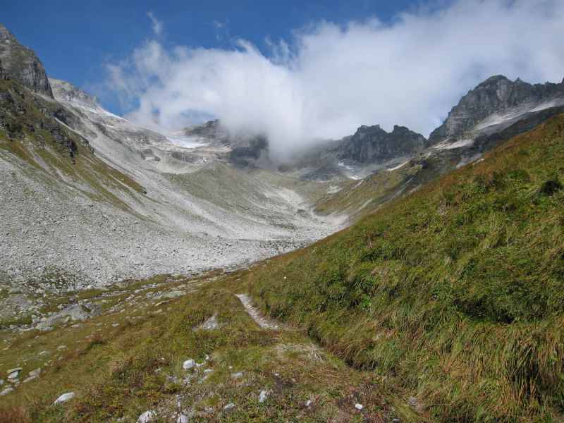 Vom Glocknerhaus geht es zunächst in leichten Kehren über die sanften Grashänge der Trögeralm später in leichtem Blockwerk immer bergan. Armin schlägt ein moderates Tempo an und Gila bildet in bewährter Weise das Schlusslicht. Begleitet werden wir im Hintergrund von einem leichten Motorengebrumm der auf der Großglocknerhochalpenstraße bergaufwärts fahrenden Motorräder.