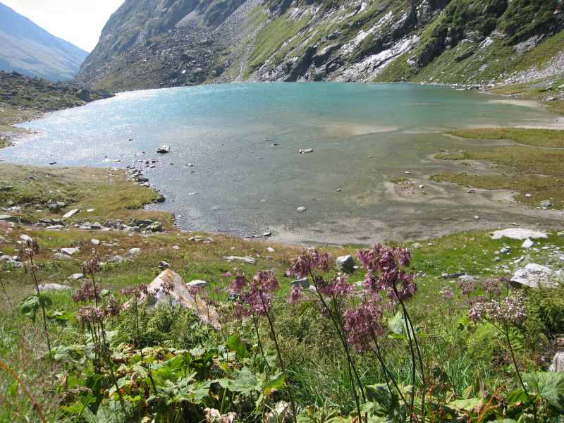 Unser Weg führt erst über grobes Geröll und Blockwerk eine Anhöhe hinauf und dann wieder 80 Meter hinunter. Eine sehr urtümliche Landschaft präsentiert sich uns. In einer Senke treffen wir in einem sich ständig verändernden Bachlauf Alpenmauerpfeffer und sternblütigen Steinbrech an.