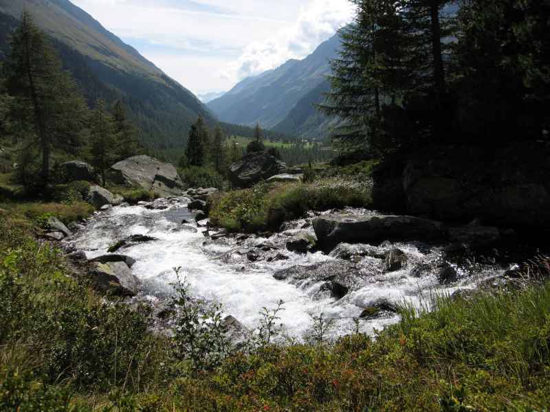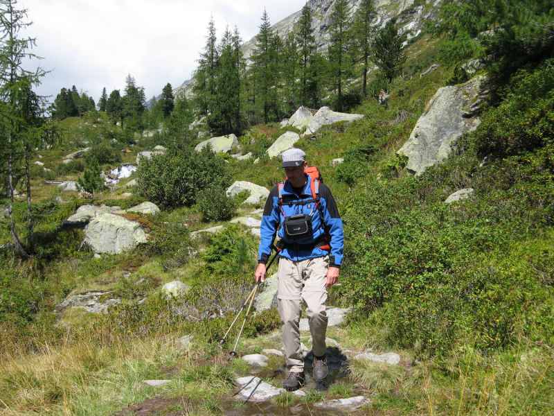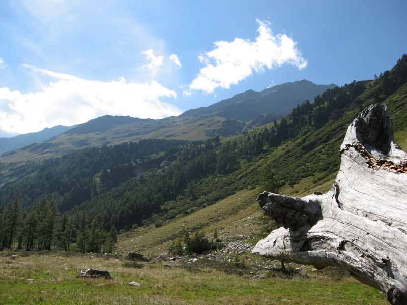 Am Kalser Tauern kann ich Dagmar gerade noch bremsen. Offensichtlich kann sie schon wieder Bäume ausreißen. Nur mit viel Überredungskunst kann ich sie nach ihrer gerade überstandenen Krankheit von einem Abstecher zum Medelzkopf abhalten. Stattdessen streben wir in vielen Kehren dem Erdigen Eck entgegen, wo gestern die Gruppe zum Selesia-Höhenweg abgezweigt ist. Wir hingegen bleiben auf dem Weg im Talboden des Dorfertals und genießen die warmen Sonnenstrahlen in diesem ursprünglichen Tal.