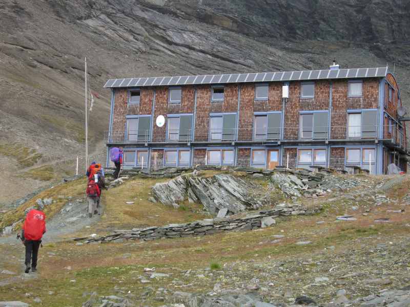 Wir gehen weiter über die Pfortscharte auf 2.828 Meter und in Kehren wieder weit hinab. In der Ferne sehen wir sie schon liegen, die Salmhütte. Sie liegt auf 2.638 Metern Höhe.