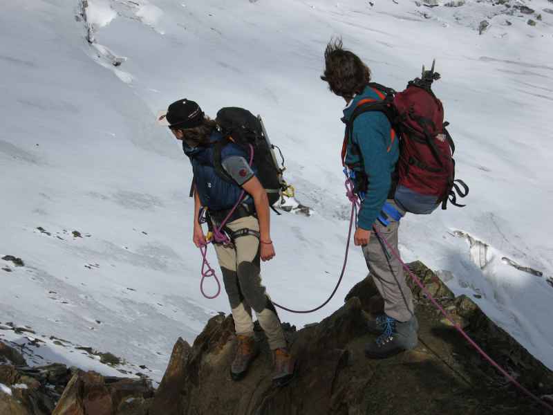 Nun lassen wir die Rucksäcke auf der Hütte zurück und nehmen nur Wetterschutz und die Kameras mit. Hinter der Hütte legen wir die Steigeisen an und binden uns wieder in die Seilschaften ein. Über das Hoffmannskees geht es in großen Kehren nach oben.