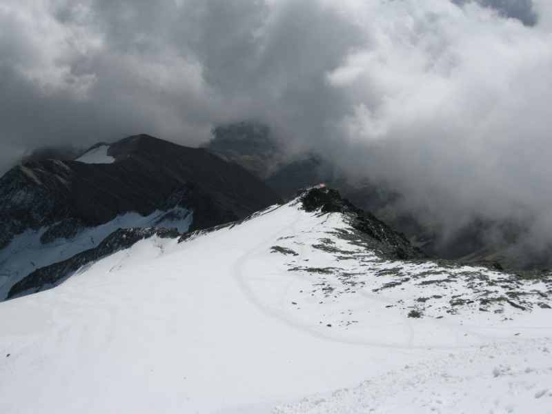 Nach der Pause unternehmen wir zur Höhenanpassung noch eine kleine Tour zur sogenannten Schere auf 3.037 Meter. Leider machen die Wolken nicht auf und so bleibt uns der Blick auf den Glockner heute verwehrt. Von der Schere aus können wir unter uns das Ködnitzkees liegen sehen, auf dem, bei schlechter Sicht, noch einige Seilschaften in Richtung Adlersruhe unterwegs sind.