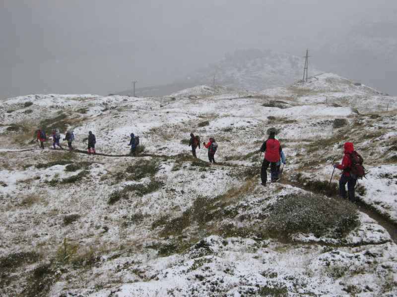 Nach einer halben Stunde steigen wir über den gleichen Weg wieder ab und kommen nun in leichten Schneefall. An der Hütte angekommen begießen wir den Erfolg mit einem Zirbenlikör. Toni und Cora steigen sofort wieder ins Tal ab, aber wir anderen bleiben hier oben und werden hier übernachten. Es wird noch ein sehr netter Abend. Ab und zu fällt unser Blick nach draußen – es schneit immer noch – aber der Abstieg ist erst morgen.