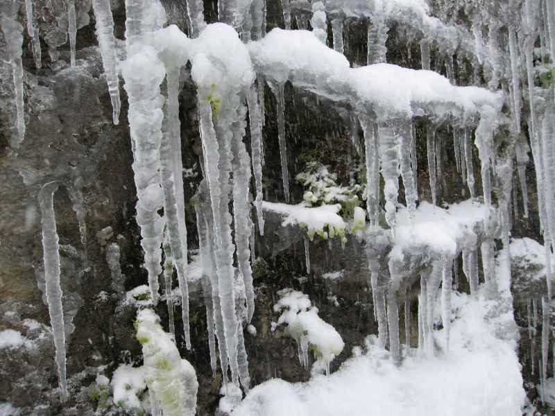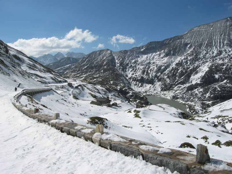 Um uns die Zeit zu vertreiben und frische Luft zu tanken unternehmen wir eine kleine Wanderung zum 100 Meter tiefer gelegenen Stausee „Margaritze“. Wir können kaum den Weg erkennen und auf dem Rückweg sind schon nach kurzer Zeit alle unsere Spuren zugeschneit.