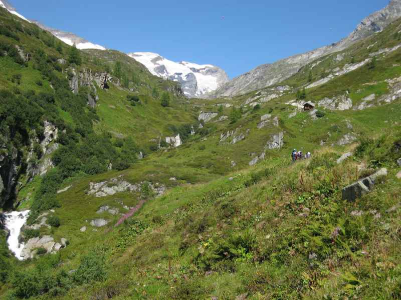 Die Landschaft nimmt uns von Beginn an für sich ein. Der lichte Baumbestand bietet hin und wieder einen willkommenen Schutz vor der Sonne. Die Blicke werden freier und im ersten Anblick der Gletscher machen wir immer mal wieder Halt um zu schauen. Ständig hört man den Maurerbach im Talboden. Hinter der Stoanalm passieren wir die Talstation der Materialseilbahn zur Essener-Rostockerhütte. An dem Wasserfall des Maurerbachs haben die Venediger-Bergführer einen Klettersteig angelegt.