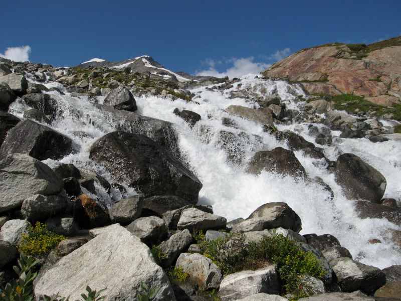 An einer Kurve des Weges stehen wir vor den rauschenden Wassern des Maurerbachs. Die feinen Wassertropfen, die unsere Haut benetzen, sind nach dem Aufstieg in der Mittagshitze eine Wohltat. Nach einem nun folgenden kurzen Anstieg kommen wir an der von Tagesausflüglern belagerten Essener-Rostocker-Hütte auf 2.208 Metern Höhe an. Die Hütte ist sehr gut besucht, sie ist ja auch ein lohnendes Ausflugsziel. Wir stärken uns zunächst bei einer Suppe machen eine kurze Rast.