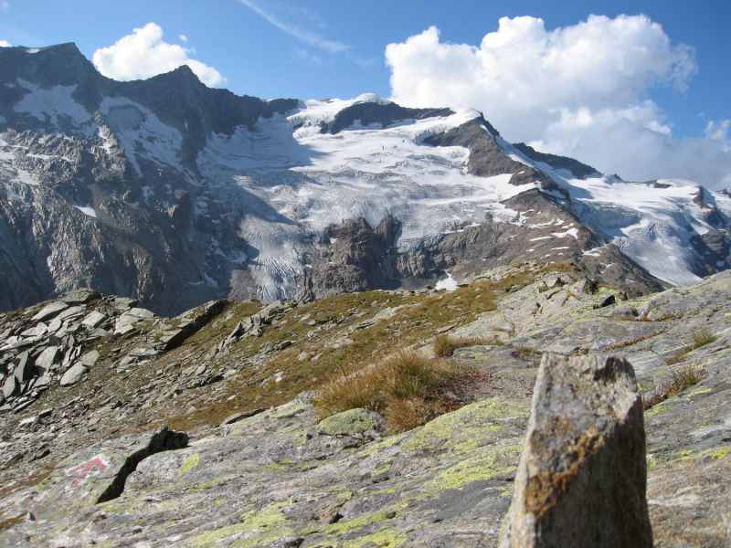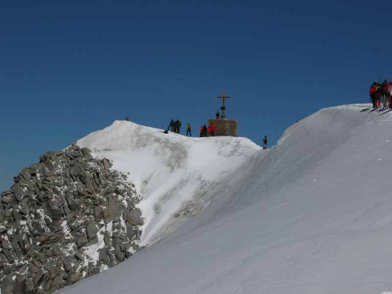 Wir stehen um 12.00 Uhr auf dem Gipfel in 3.329 m Höhe. Mit großartigen Blicken in alle Richtungen werden wir für unsere Mühen belohnt. Unser morgiges Tagesziel, die Neue Prager Hütte, können wir auch schon ausmachen. Über den Grat spazieren wir noch zu einem zweiten Kreuz. Blicke zurück und nach vorne - was immer uns die Wolken preisgeben. Auch an dem Rückweg erfreuen wir uns, lassen uns Zeit - ein Traumtag.